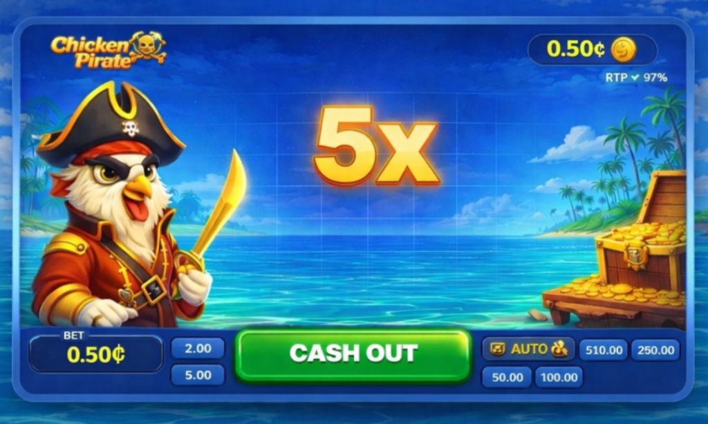To understand how a fifty-cent deposit behaves in Chicken Pirate, it is necessary to examine the interface that controls every round. Unlike slot machines that display reels and symbols, the visual structure of this game focuses almost entirely on the multiplier and the moment when the player chooses to collect it.