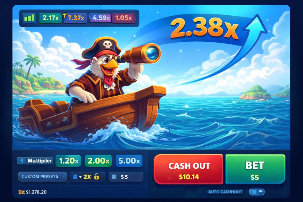 Chicken Pirate adopts this concept and presents it within a themed visual environment. The game uses animated sequences and a progression mechanic that allows the multiplier to increase until the round concludes. While the visual design adds personality to the experience, the core mechanic remains the rising multiplier that defines the entire format.